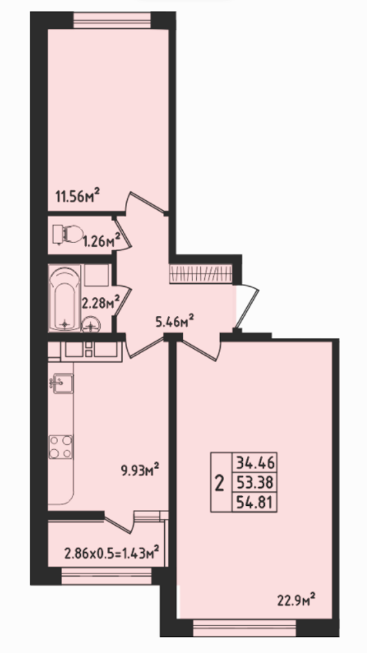 Общая площадь: 54 м (жилая 38 м, кухня 10 м)
